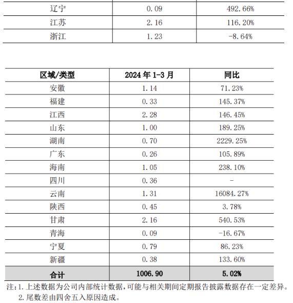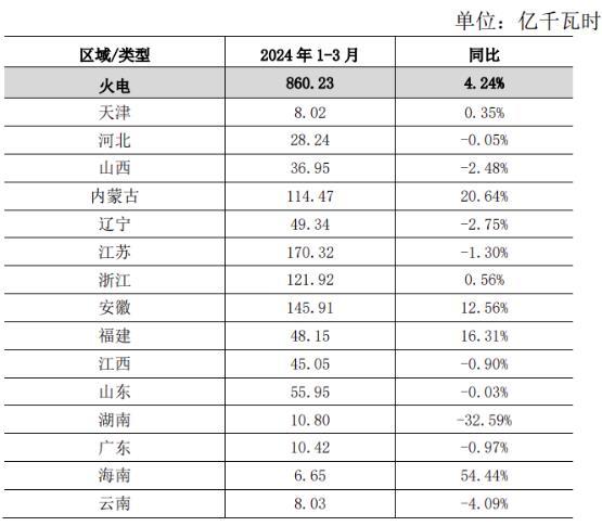 近日,国电电力发布2024年一季度电量情况公告,截至2024年3月31日,公司合并报表口径完成发电量1062.44亿千瓦时,上网电量1006.90亿千瓦时,较上年同期分别增长4.98%和5.02%;参与市场化交易电量占上网电量的92.85%;平均上网电价455.58元/千千瓦时。受全社会用电量增长影响,公司2024年一季度上网电量同比增长。公司相关区域上网电量情况如下: