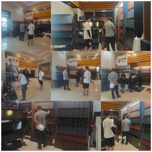 技术员不仅详细介绍了彩石金属瓦的材质构成、生产工艺、防水防火性能等专业知识,还通过实物对比、性能演示等方式,让客户直观感受到彩石金属瓦相较于传统瓦材的显著优势。其卓越的耐久性、轻质高强、易安装维护等特点,赢得了在场客户的阵阵赞叹。